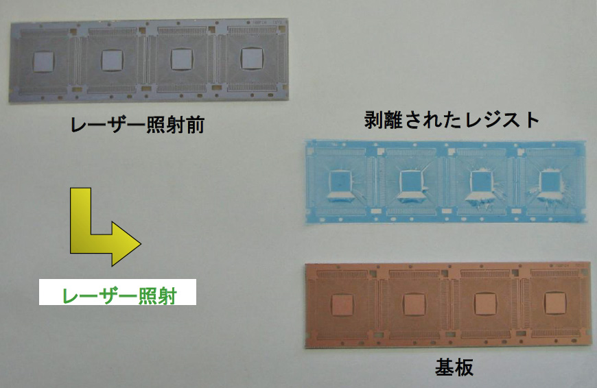 微細金属パーツをフォトリソグラフィを用いた化学エッチングで製造する際には、金属基板上にレジスト膜を密着させており、 最終工程でこのレジスト膜を除去する必要があります。従来技術では化学薬品で膨潤、あるいは溶解していました。作業環境の改善、環境汚染の点から、 このような行程のドライプロセス化が望まれています。このレジスト除去にレーザー光を用いる技術が開発されました。 金属基板とレジスト膜からなる多層構造に対してレジスト膜サイドから金属に損傷を与えない程度の適度な強度のパルスレーザー光を照射すると、 レジスト膜が剥離する現象が見出されました。レジスト膜はレーザー照射により蒸散するのではなく、その形状を保ったまま基板から剥離されます。